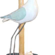 The base of the holder is crafted from bamboo wood, with a sand and water scene embedded. Resting on top of the base is a stunning sculpture of a seabird, gracefully perched and ready to take flight.